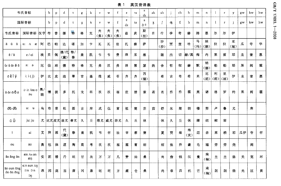 圖1 國標《外語地名漢字譯寫導則英語》中的英漢音譯表(部分)